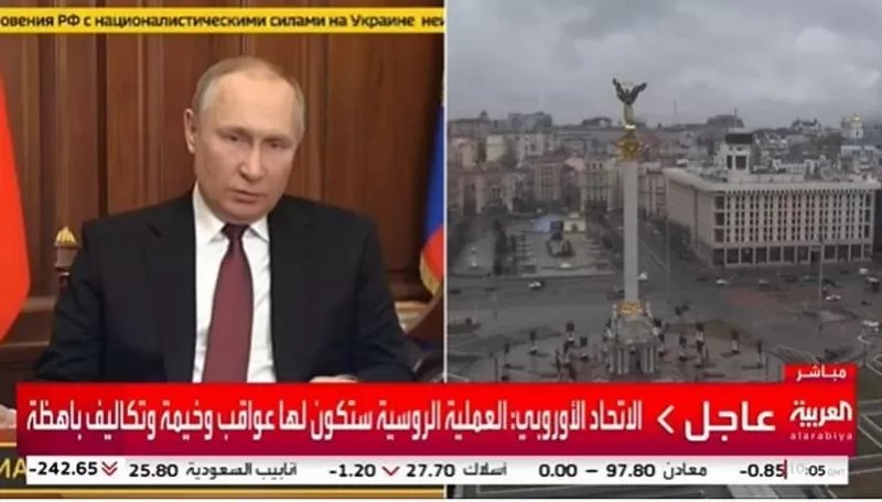 العربیه که در عربستان سعودی مستقر است، پخش برنامه صبحگاهی را قطع کرد تا از تازهترین اتفاقات در اوکراین گزارش بدهد. این شبکه برنامه ویژهای برای پوشش “عملیات نظامی روسیه علیه اوکراین” پخش کرد. العربیه همچنین اطلاعیههای وزارت دفاع روسیه و واکنشهای آمریکا را پخش میکرد.