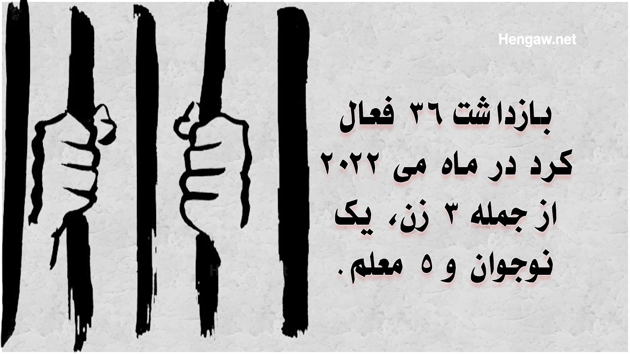 با استناد بە آمار بە ثبت رسیدە در مرکز آمار و اسناد سازمان حقوق بشری هەنگاو، طی ماه می ۲۰۲۲، دستکم بازداشت ۳۶ شهروند کُرد توسط نهادهای امنیتی حکومت ایران بە اتهام فعالیت سیاسی، مدنی و صنفی ثبت شده است.