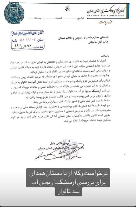 نامه کانون وکلای دادگستری استان همدان به دادستان همدان درباره #آب_سمی همدان‼️ 27/08/2022 اخبار وکلای همدانی میگويند آبی که بنا است از سد تالوار وارد مدار آب شهری همدان شود #آرسنیک بالاتر از حد مجاز دارد و تاکید دارند که سمی است و خواستار ورود دادستان به مبحث تحقیق در این خصوص ش SHORESH راهبری نوشته PreviousPrevious post:مشاور ستاد مرکزی اربعین از انبار کردن بیش از ۶۵۰ میلیون بطری آب معدنی برای زائران در ایام اربعین خبر داد! در حالیکه مردم در شهرهای مختلف ایران تشنه هستندNext Next post:نماینده مجلس: رئیسی شخصاً از قالیباف خواست استیضاح فاطمی امین از دستور کار خارج شود دیدگاهتان را بنویسید لغو پاسخنشانی ایمیل شما منتشر نخواهد شد. بخشهای موردنیاز علامتگذاری شدهاند *دیدگاه * ذخیره نام، ایمیل و وبسایت من در مرورگر برای زمانی که دوباره دیدگاهی مینویسم.