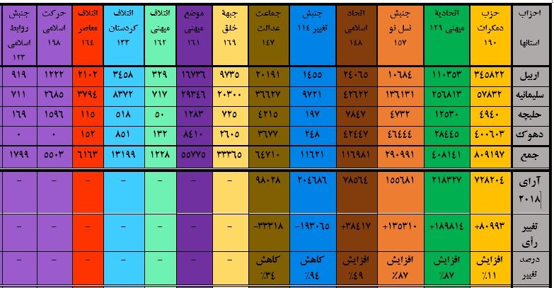 کمیسیون عالی مستقل انتخابات عراق، نتایج ششمین دورۀ انتخابات عراق را اعلام کرد که بر اساس آن آرای اکتسابی نامزدها و جریانهای کردستانی شرکت کننده در انتخابات از مجموع 99.63 آرای شمارش شده به شرح زیر است.