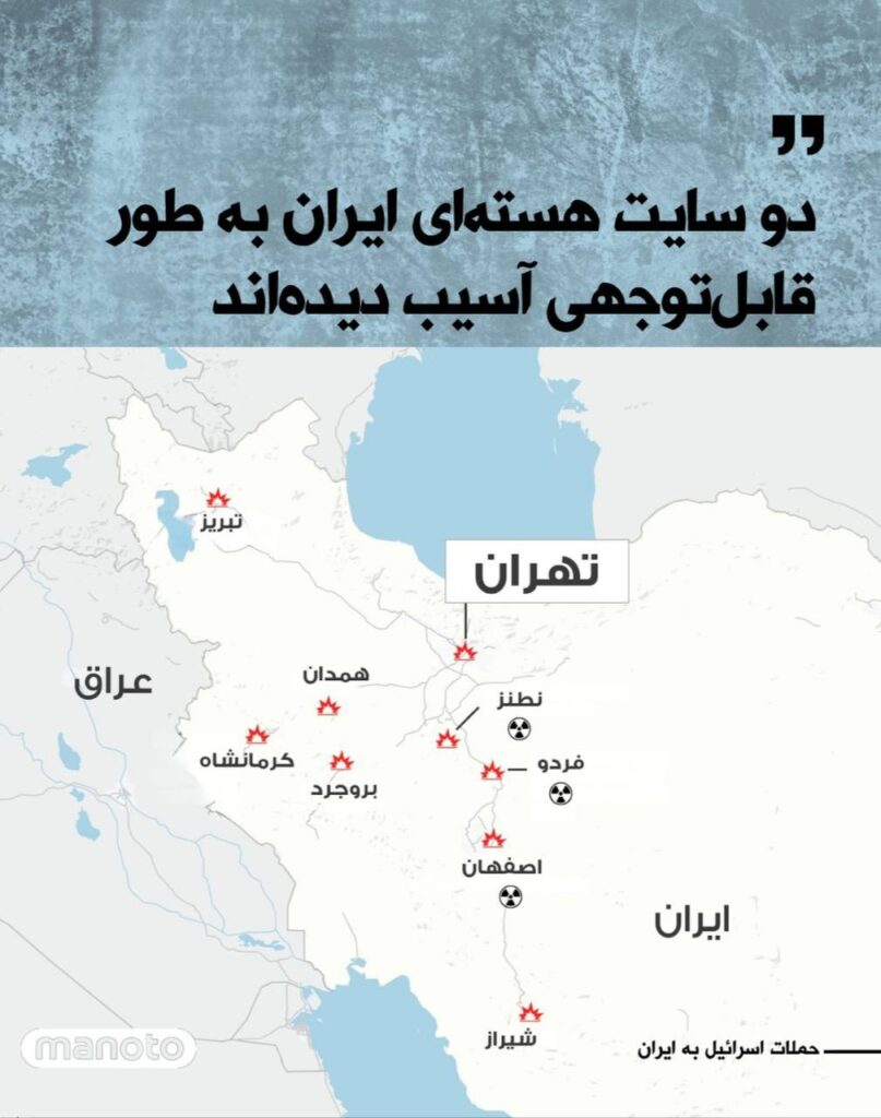 در پی حملات هوایی گسترده اسرائیل به بیش از ۱۵۰ هدف در داخل ایران، دو سایت مهم هستهای در اصفهان و نطنز بهطور قابلتوجهی آسیب دیدهاند. یک مقام نظامی اسرائیلی اعلام کرده که تعمیر این تاسیسات هفتهها زمان خواهد برد و سامانههای پدافند هوایی ایران در مهار این حمله ناکام ماندهاند. بنا به همین گزارش، راه هوایی به تهران عملاً باز بوده و حمله بدون مواجهه مؤثر با سامانههای دفاعی ایران انجام شده است.